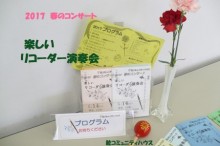 23回目となる「春のコンサート」が、睦コミュニティハウスで行われました。小さな男の子や小学生の女の子、そして素敵に年を重ねられた多くの方々が、真剣に演奏を聴いて下さいました。また、リコーダーの種類の多さにも関心を持たれた様子でした。「マ…
