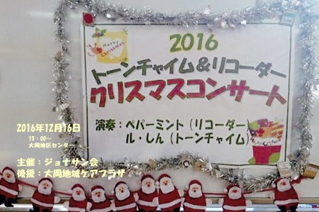 今年で8回目になる、ジョナサン会主催のクリスマスコンサートが大岡地区センターで行われました。 7種類のリコーダーとトーンチャイム、また、いろいろな打楽器の音を楽しんでいただきました。